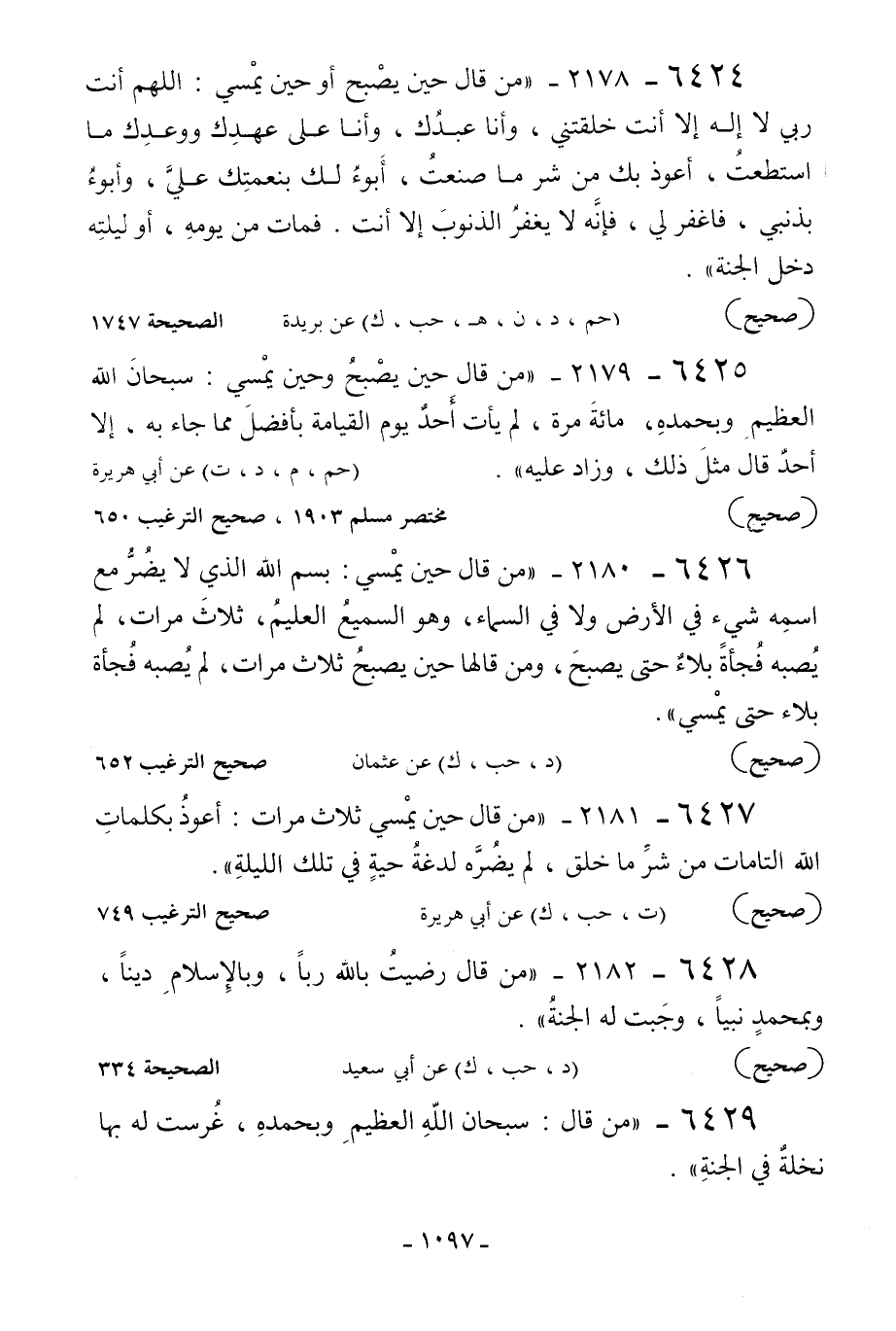 6425 - 2179 - «من قال حين يصبح وحين يمسي: سبحان الله العظيم وبحمده مائة مرة لم يأت أحد يوم القيامة بأفضل مما جاء به إلا أحد قال مثل ذلك وزاد عليه» ... [حم م د ت] عن أبي هريرة.