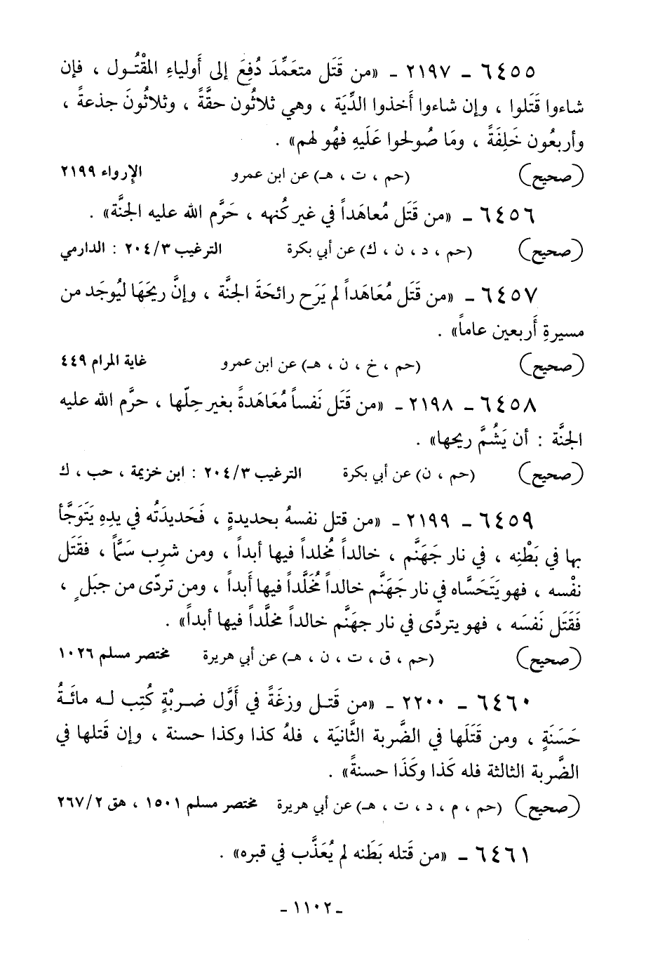 6458 - 2198 - «من قتل نفسا معاهدة بغير حلها حرم الله عليه الجنة: أن يشم ريحها» .