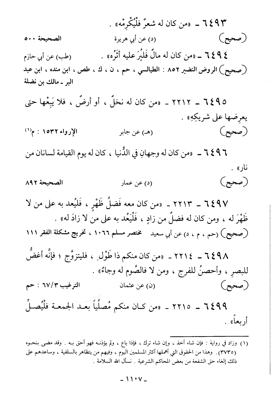 6497 - 2213 - «من كان معه فضل ظهر فليعد به على من لا ظهر له ومن كان له فضل من زاد فليعد به على من لا زاد له» .