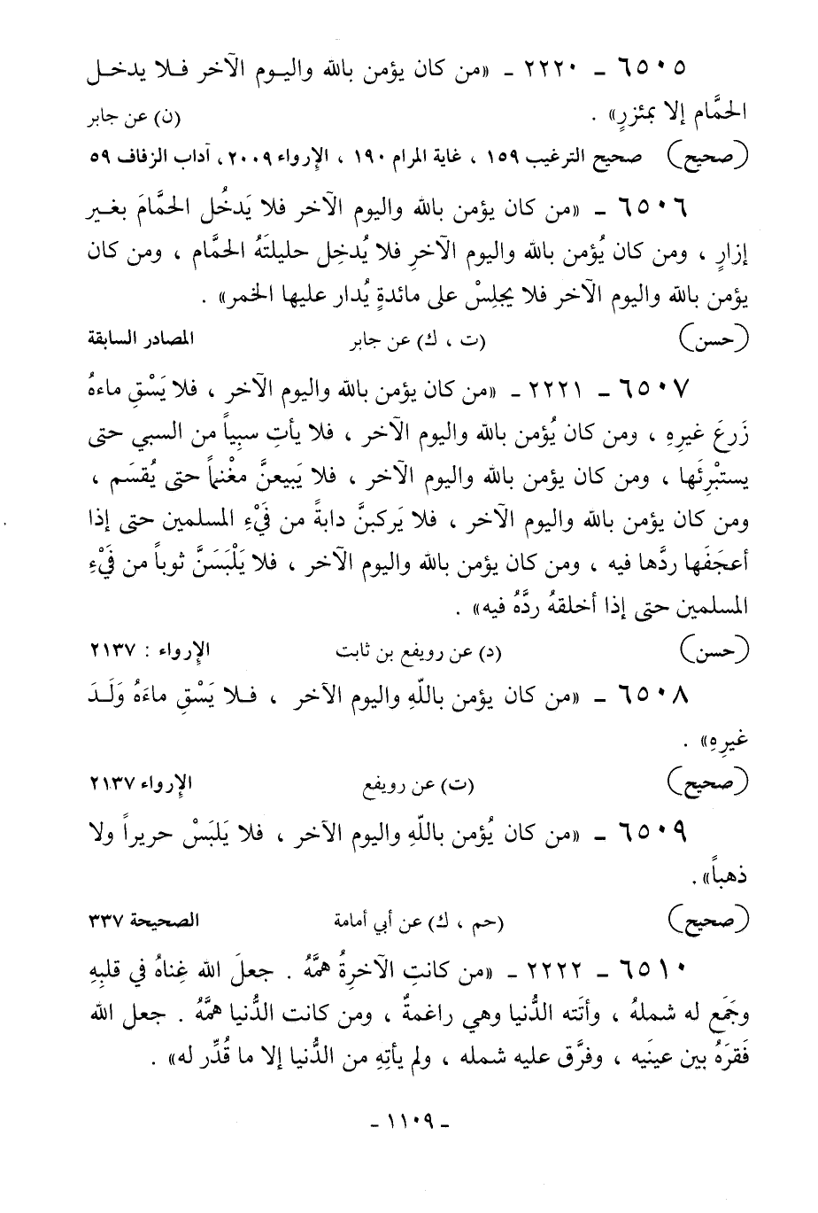 6506 - «من كان يؤمن بالله واليوم الآخر فلا يدخل الحمام بغير إزار ومن كان يؤمن بالله واليوم الآخر فلا يدخل حليلته الحمام ومن كان يؤمن بالله واليوم الآخر فلا يجلس على مائدة يدار عليها الخمر» .