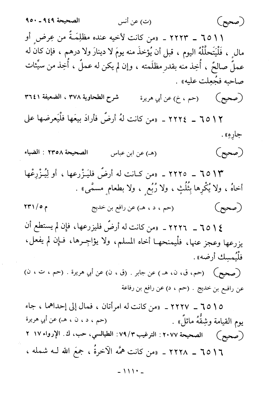 6513 - 2225 - «من كانت له أرض فليزرعها أو ليزرعها أخاه ولا يكرها بثلث ولا ربع ولا بطعام مسمى» .