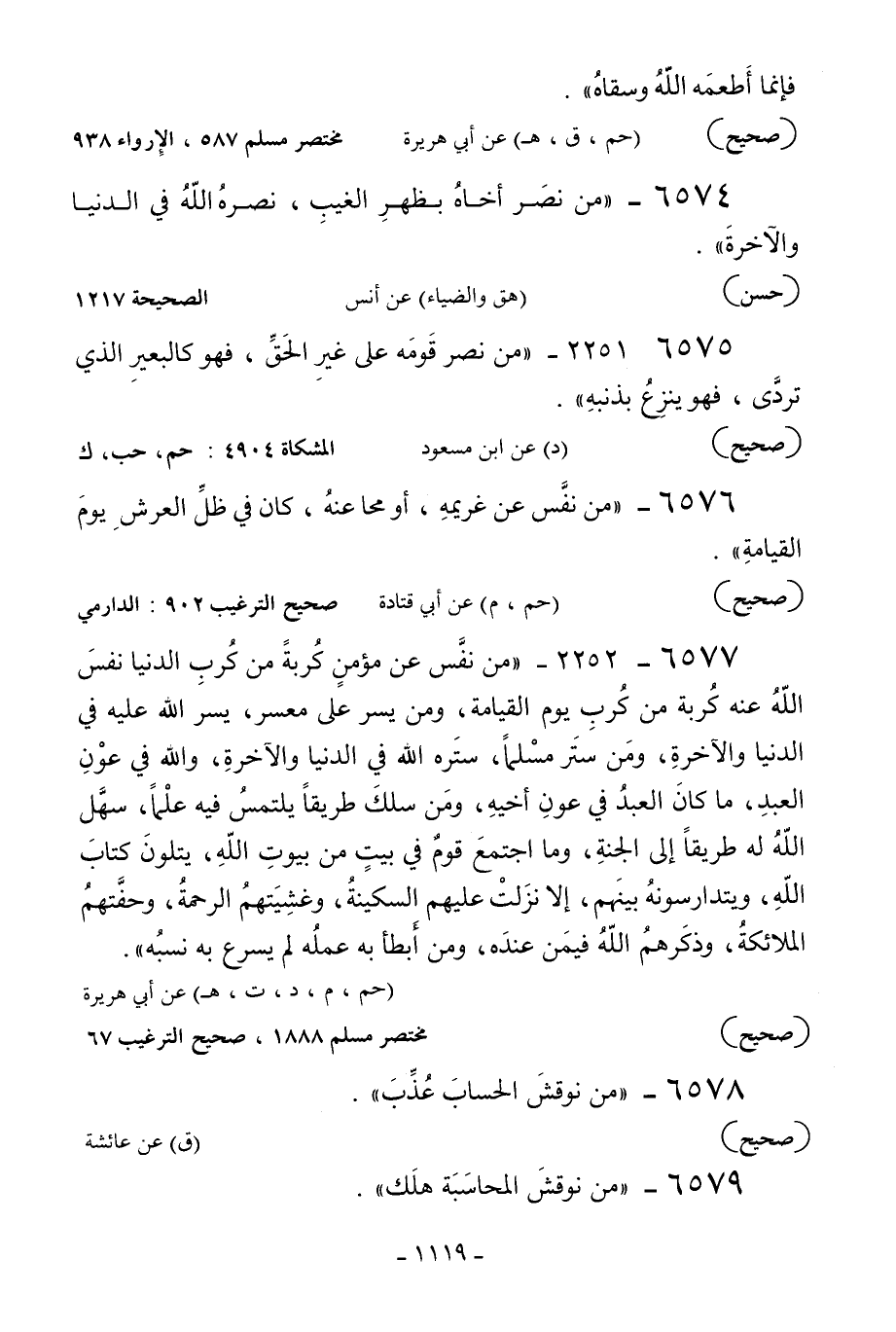 6577 - 2252 - «من نفس عن مؤمن كربة من كرب الدنيا نفس الله عنه كربة من كرب يوم القيامة ومن يسر على معسر يسر الله عليه في الدنيا والآخرة ومن ستر مسلما ستره الله في الدنيا والآخرة والله في عون العبد ما كان العبد في عون أخيه ومن سلك طريقا يلتمس فيه علما سهل الله له طريقا إلى الجنة وما اجتمع قوم في بيت من بيوت الله يتلون كتاب الله ويتدارسونه بينهم إلا نزلت عليهم السكينة وغشيتهم الرحمة وحفتهم الملائكة وذكرهم الله فيمن عنده ومن أبطأ به عمله لم يسرع به نسبه» ... [حم م د ت هـ] عن أبي هريرة.