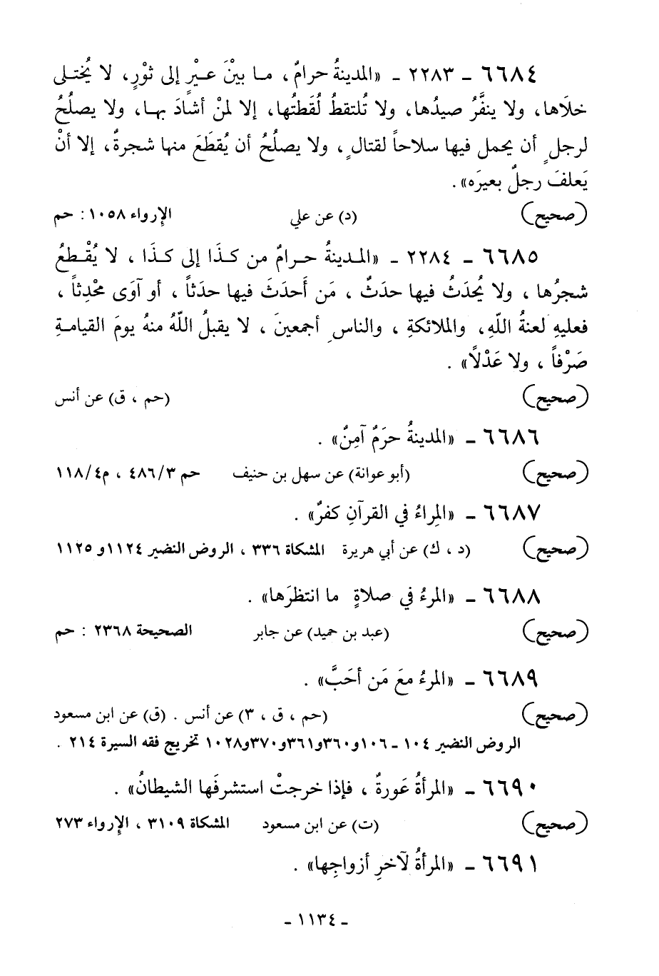 6684 - 2283 - «المدينة حرام ما بين عير إلى ثور لا يختلى خلاها ولا ينفر صيدها ولا تلتقط لقطتها إلا لمن أشاد بها ولا يصلح لرجل أن يحمل فيها سلاحا لقتال ولا يصلح أن يقطع منها شجرة إلا أن يعلف رجل بعيره» .
