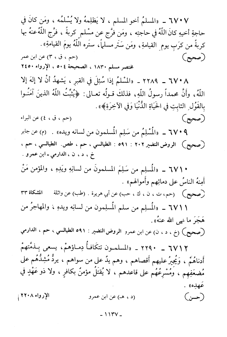6710 - «المسلم من سلم المسلمون من لسانه ويده والمؤمن من أمنه الناس على دمائهم وأموالهم» .