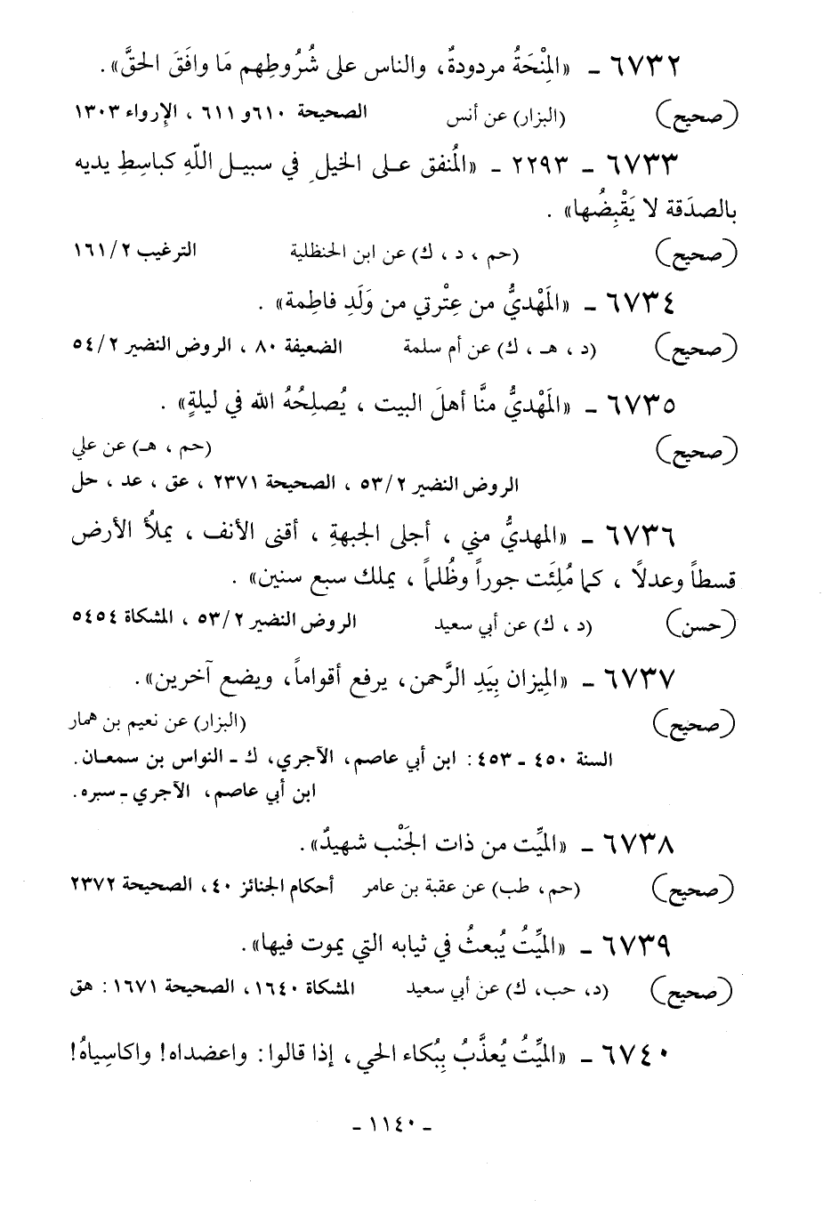 6736 - «المهدي مني أجلى الجبهة أقنى الأنف يملأ الأرض قسطا وعدلا كما ملئت جورا وظلما يملك سبع سنين» .