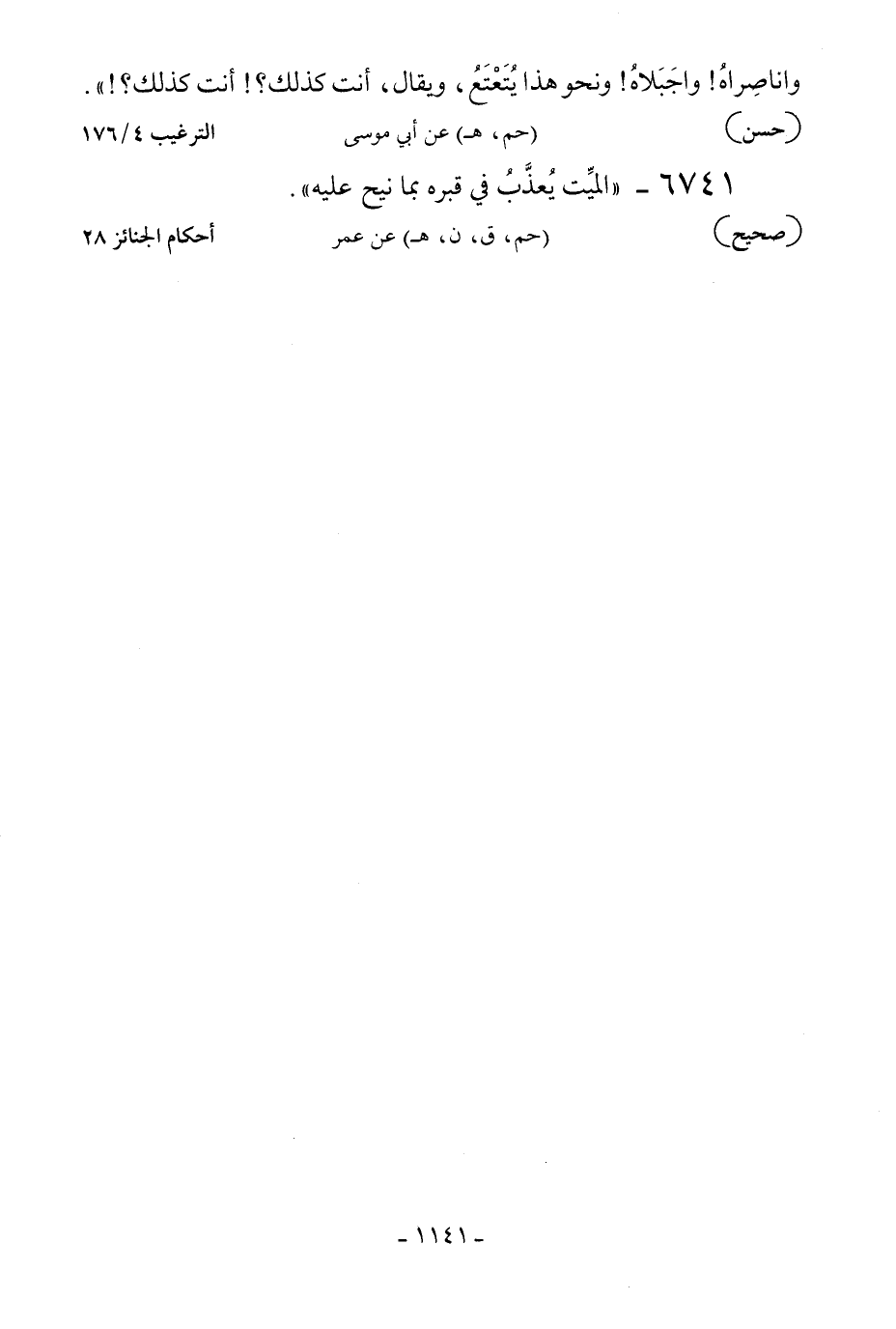 6741 - «الميت يعذب في قبره بما نيح عليه» .