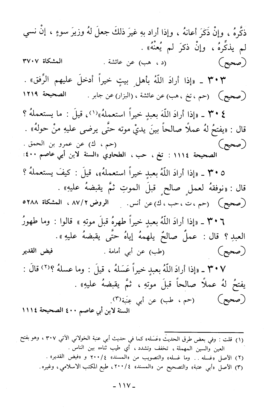 307 - «إذا أراد الله بعبد خيرا عسله قيل: وما عسله؟ 2 قال: يفتح له عملا صالحا قبل موته ثم يقبضه عليه» .