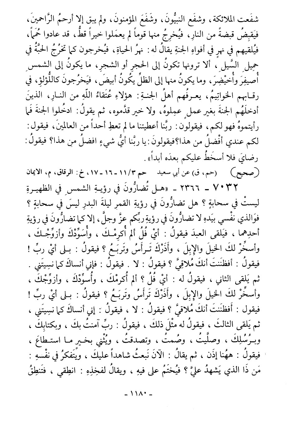 7032 - 2366 - "هل تضارون في رؤية الشمس في الظهيرة ليست في سحابة؟ هل تضارون في رؤية القمر ليلة البدر ليس في سحابة؟ فوالذي نفسي بيده لا تضارون في رؤية ربكم عز وجل إلا كما تضارون في رؤية أحدهما فيلقى العبد فيقول: أي فل ألم أكرمك وأسودك وأزوجك وأسخر لك الخيل والإبل وأذرك ترأس وتربع؟ فيقول: بلى أي رب فيقول: أفظننت أنك ملاقي؟ فيقول: لا فيقول: إني أنساك كما نسيتني; ثم يلقى الثاني فيقول له: أي فل؟ ألم أكرمك وأسودك وأزوجك وأسخر لك الخيل والإبل وأذرك ترأس وتربع؟ فيقول: بلى أي رب! فيقول: أفظننت أنك ملاقي؟ فيقول: لا فيقول: إني أنساك كما نسيتني; ثم يلقى الثالث فيقول له مثل ذلك فيقول: رب آمنت بك وبكتابك وبرسلك وصليت وصمت وتصدقت ويثني بخير ما استطاع فيقول: هاهنا إذن ثم يقال: الآن نبعث شاهدا عليك ويتفكر في نفسه: من ذا الذي يشهد علي؟ فيختم على فيه ويقال لفخذه: انطقي فتنطق