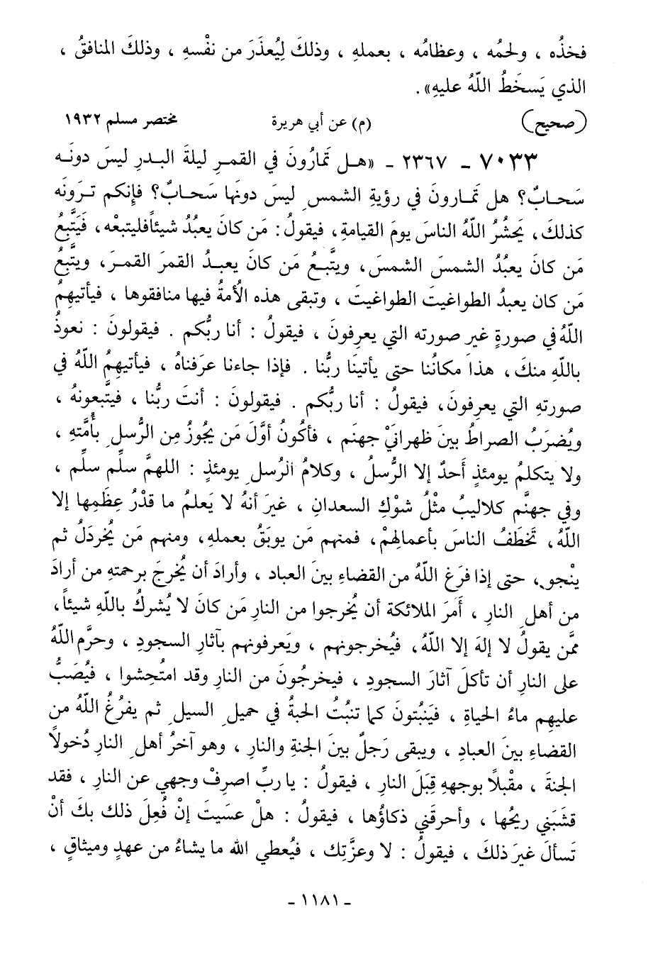 7033 - 2367 - "هل تمارون في القمر ليلة البدر ليس دونه سحاب؟ هل تمارون في رؤية الشمس ليس دونها سحاب؟ فإنكم ترونه كذلك يحشر الله الناس يوم القيامة فيقول: من كان يعبد شيئا فليتبعه فيتبع من كان يعبد الشمس الشمس ويتبع من كان يعبد القمر القمر ويتبع من كان يعبد الطواغيت الطواغيت وتبقى هذه الأمة فيها منافقوها; فيأتيهم الله في صورة غير صورته التي يعرفون فيقول: أنا ربكم فيقولون: نعوذ بالله منك هذا مكاننا حتى يأتينا ربنا فإذا جاءنا عرفناه فيأتيهم الله في صورته التي يعرفون فيقول: أنا ربكم فيقولون: أنت ربنا فيتبعونه; ويضرب الصراط بين ظهراني جهنم فأكون أول من يجوز من الرسل بأمته ولا يتكلم يومئذ أحد إلا الرسل وكلام الرسل يومئذ: اللهم سلم سلم وفي جهنم كلاليب مثل شوك السعدان غير أنه لا يعلم ما قدر عظمها إلا الله تخطف الناس بأعمالهم فمنهم من يوبق بعمله ومنهم من يخردل ثم ينجوحتى إذا فرغ الله من القضاء بين العباد وأراد أن يخرج برحمته من أراد من أهل النار أمر الملائكة أن يخرجوا من النار من كان لا يشرك بالله شيئا ممن يقول لا إله إلا الله فيخرجونهم ويعرفونهم بآثار السجود وحرم الله على النار أن تأكل آثار السجود فيخرجون من النار وقد امتحشوا فيصب عليهم ماء الحياة فينبتون كما تنبت الحبة في حميل السيل ثم يفرغ الله من القضاء بين العباد ويبقى رجل بين الجنة والنار وهو آخر أهل النار دخولا الجنة مقبلا بوجهه قبل النار فيقول: يا رب اصرف وجهي عن النار فقد قشبني ريحها وأحرقني ذكاؤها فيقول: هل عسيت إن فعل ذلك بك أن تسأل غير ذلك فيقول: لا وعزتك فيعطي الله ما يشاء من عهد وميثاق،