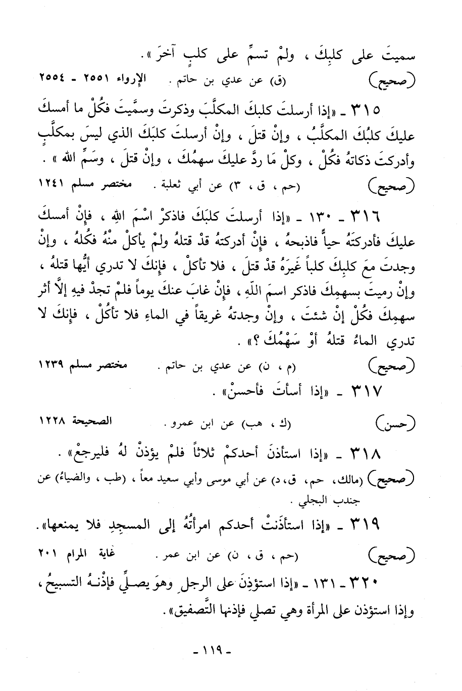 316 - 130 - «إذا أرسلت كلبك فاذكر اسم الله فإن أمسك عليك فأدركته حيا فاذبحه فإن أدركته قد قتله ولم يأكل منه فكله, وإن وجدت مع كلبك كلبا غيره قد قتل فلا تأكل فإنك لا تدري أيها قتله وإن رميت بسهمك فاذكر اسم الله فإن غاب عنك يوما فلم تجد فيه إلا أثر سهمك فكل إن شئت وإن وجدته غريقا في الماء فلا تأكل فإنك لا تدري الماء قتله أو سهمك؟» .