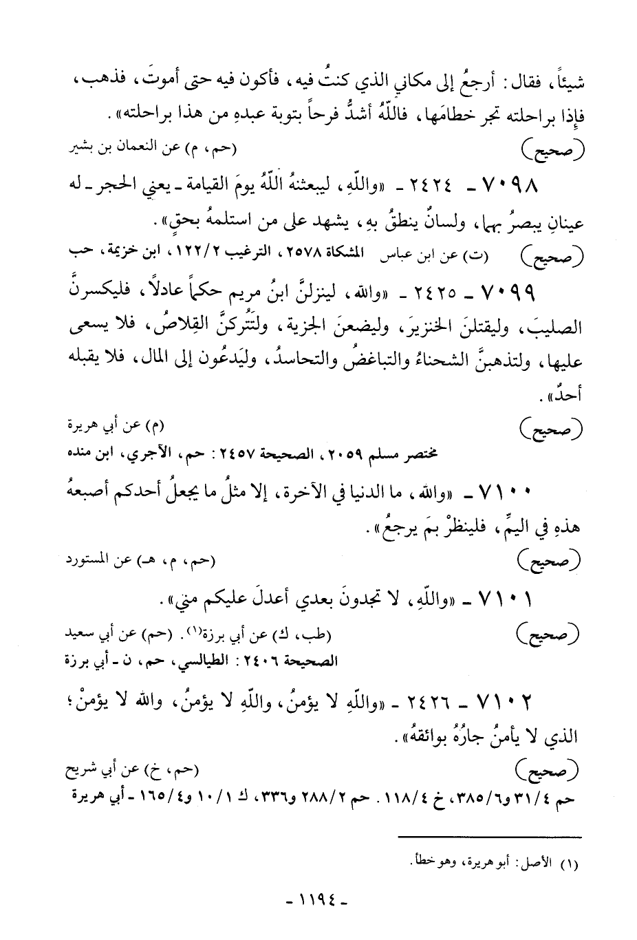 7102 - 2426 - «والله لا يؤمن والله لا يؤمن والله لا يؤمن الذي لا يأمن جاره بوائقه» .