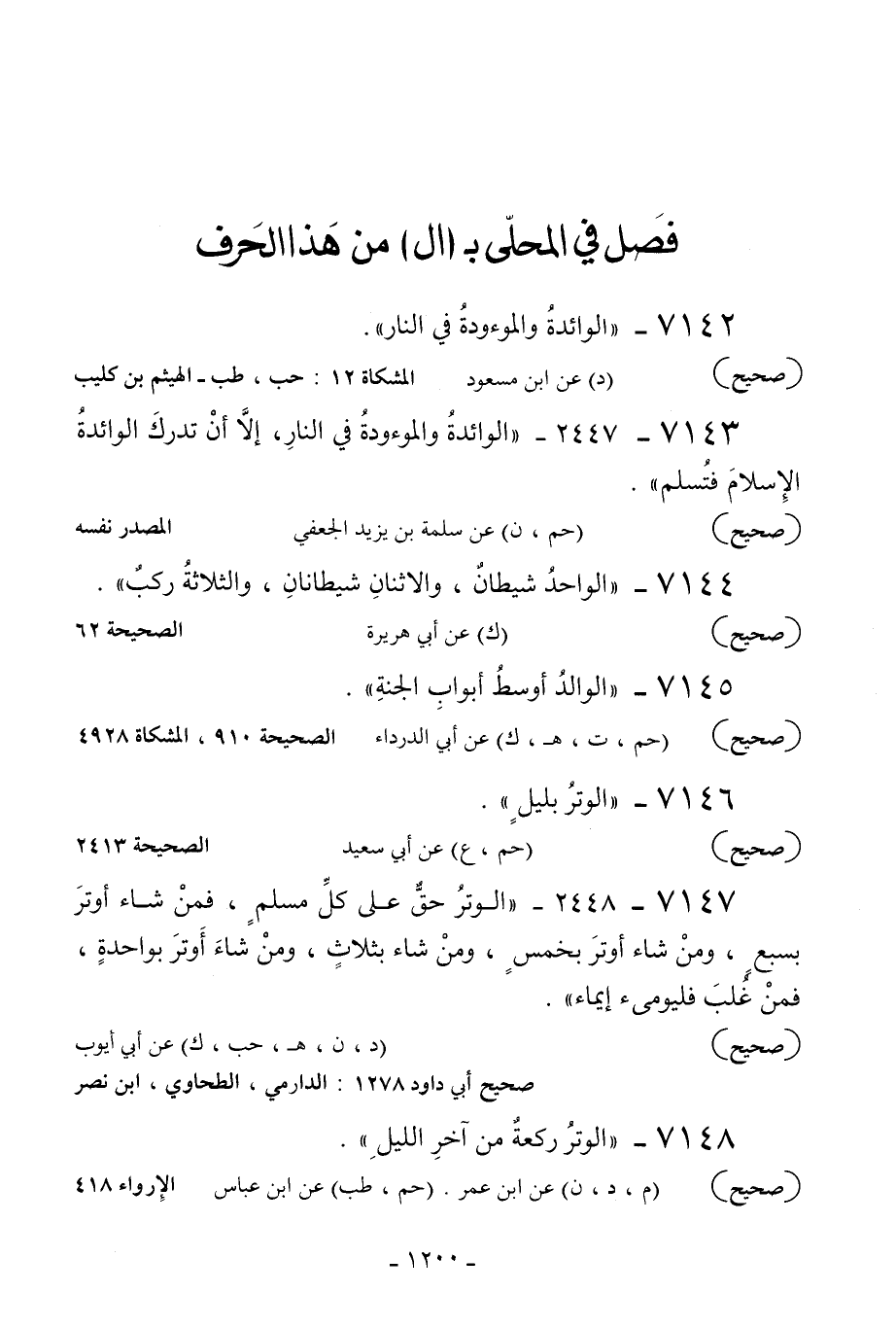7147 - 2448 - «الوتر حق على كل مسلم فمن شاء أوتر بسبع ومن شاء أوتر بخمس ومن شاء بثلاث ومن شاء أوتر بواحدة فمن غلب فليومئ إيماء» .