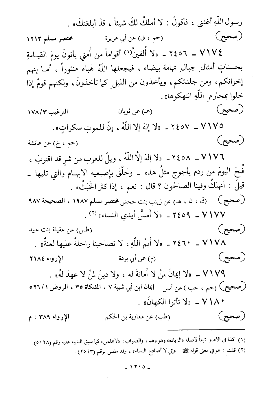 7174 - 2456 - «لا ألفين1 أقواما من أمتي يأتون يوم القيامة بحسنات أمثال جبال تهامة بيضاء فيجعلها الله هباء منثورا أما إنهم إخوانكم ومن جلدتكم ويأخذون من الليل كما تأخذون ولكنهم قوم إذا خلوا بمحارم الله انتهكوها» .