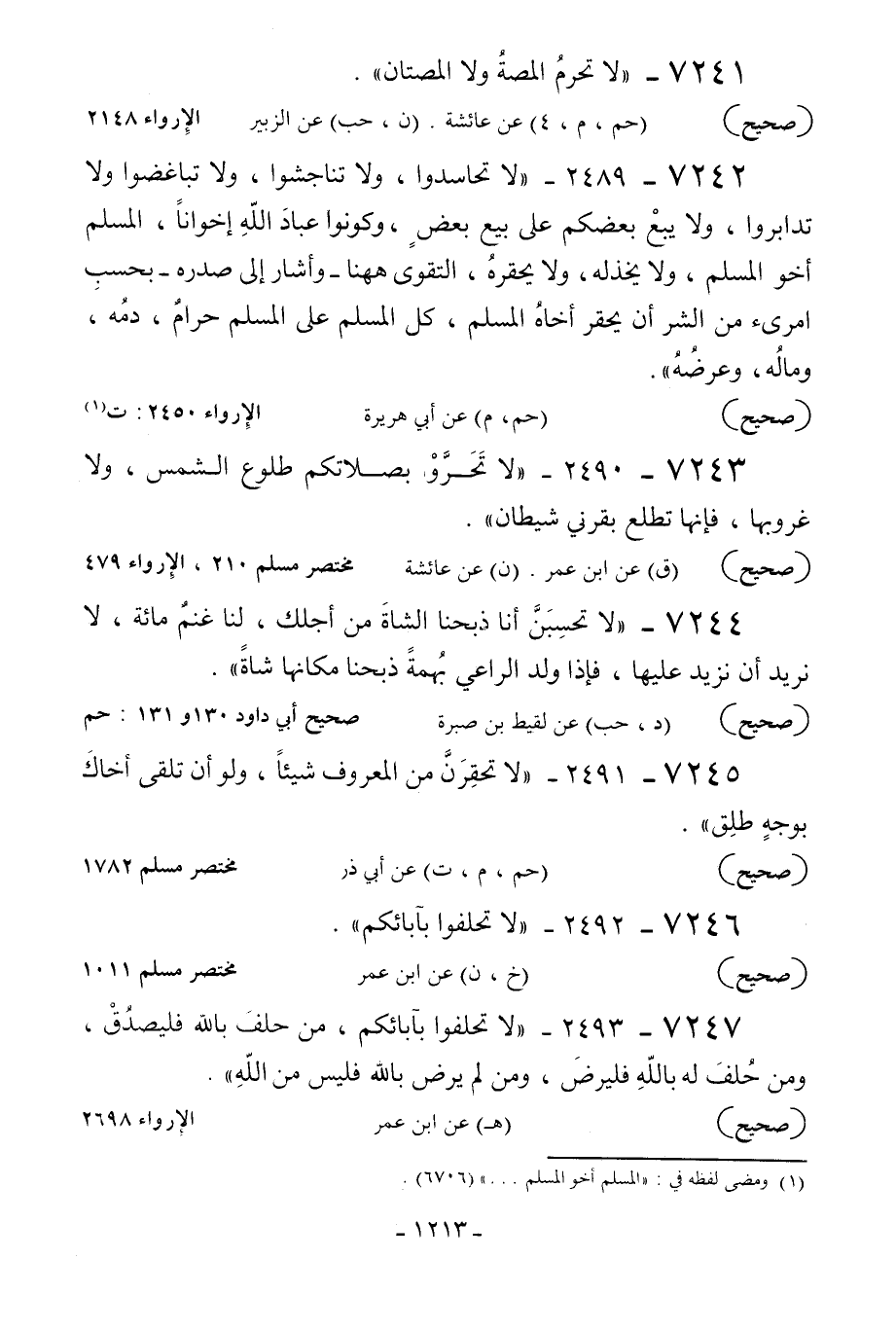 7242 - 2489 - «لا تحاسدوا ولا تناجشوا ولا تباغضوا ولا تدابروا ولا يبع بعضكم على بيع بعض وكونوا عباد الله إخوانا المسلم أخوالمسلم ولا يخذله ولا يحقره التقوى هاهنا - وأشار إلى صدره - بحسب امرئ من الشر أن يحقر أخاه المسلم كل المسلم على المسلم حرام دمه وماله وعرضه» .