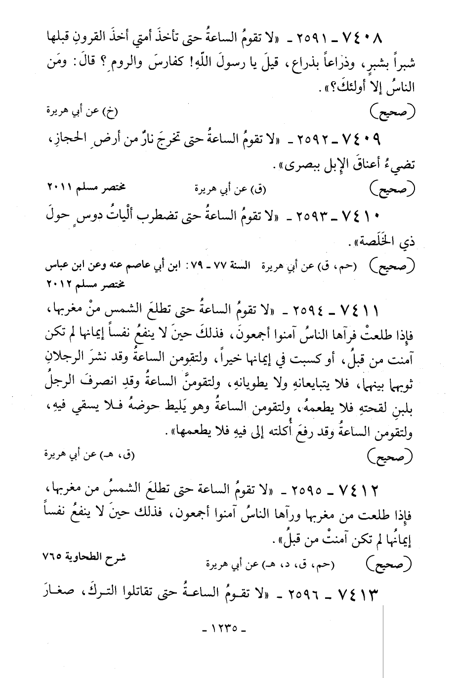 7412 - 2595 - «لا تقوم الساعة حتى تطلع الشمس من مغربها فإذا طلعت من مغربها ورآها الناس آمنوا أجمعون فذلك حين لا ينفع نفسا إيمانها لم تكن آمنت من قبل» .