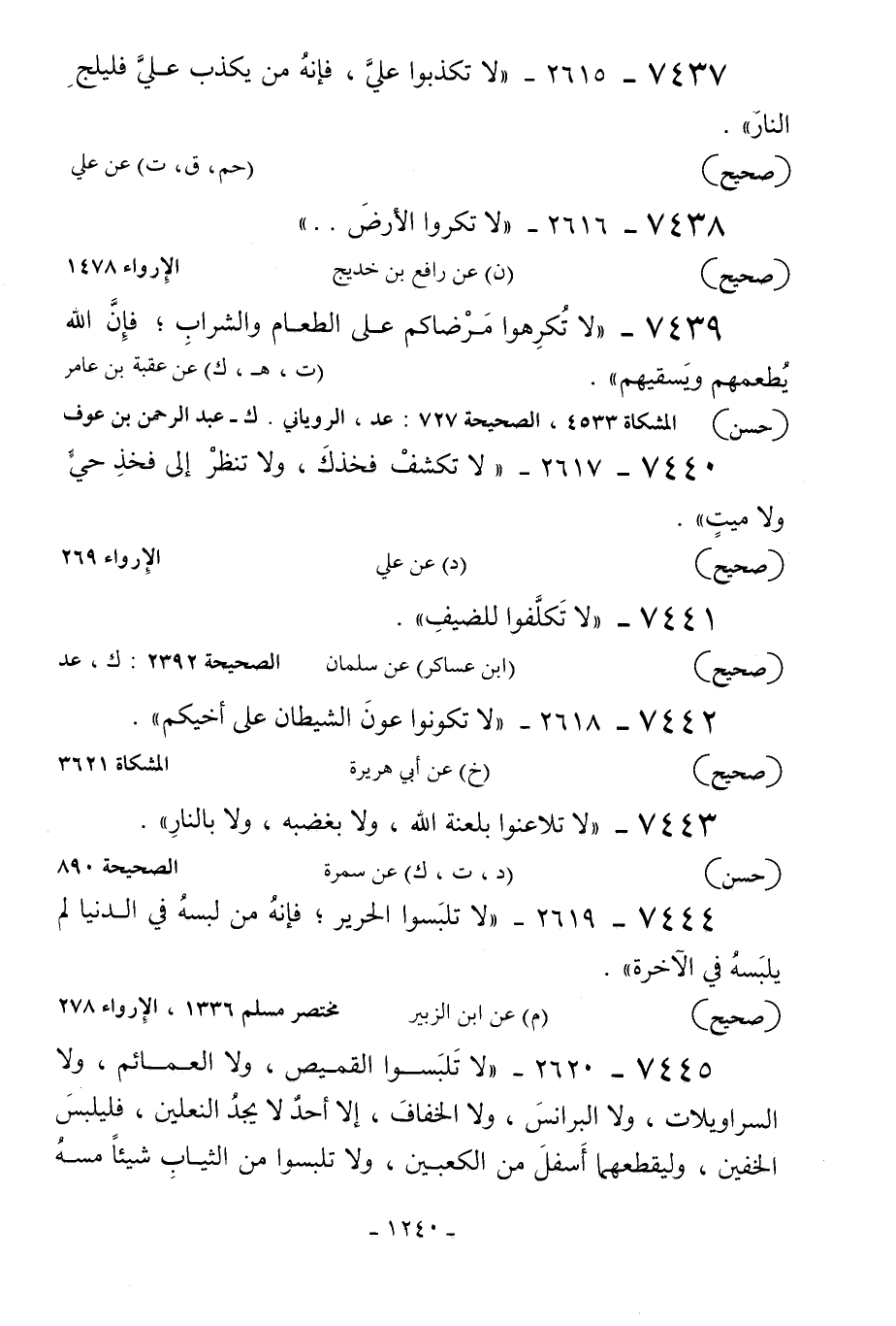 7444 - 2619 - «لا تلبسوا الحرير فإنه من لبسه في الدنيا لم يلبسه في الآخرة» .