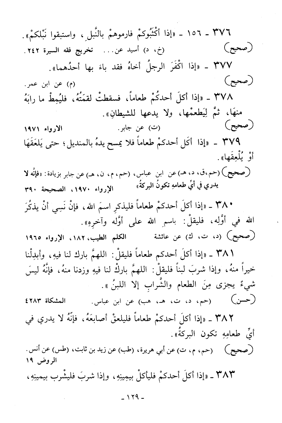 378 - «إذا أكل أحدكم طعاما فسقطت لقمته فليمط ما رابه منها ثم ليطعمها ولا يدعها للشيطان» .