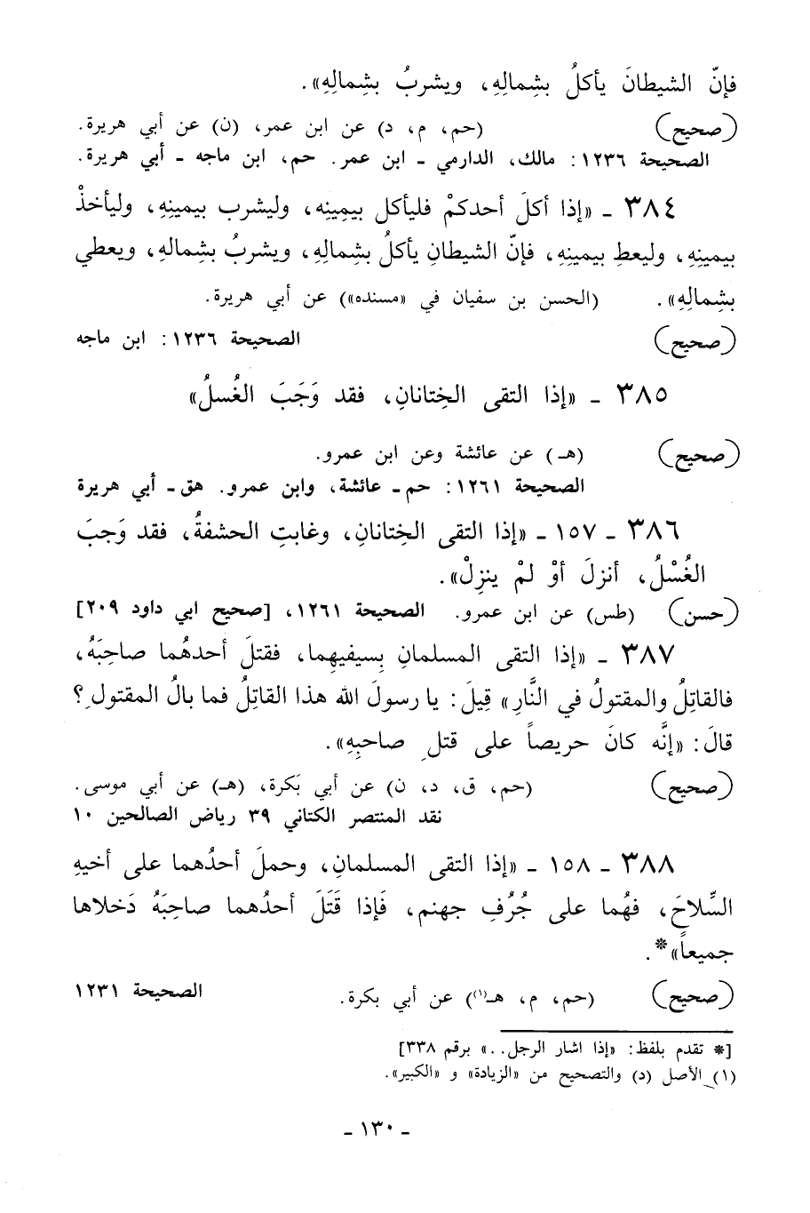 384 - «إذا أكل أحدكم فليأكل بيمينه وليشرب بيمينه وليأخذ بيمينه وليعط بيمينه فإن الشيطان يأكل بشماله ويشرب بشماله ويأخذ بشماله ويعطي بشماله» .