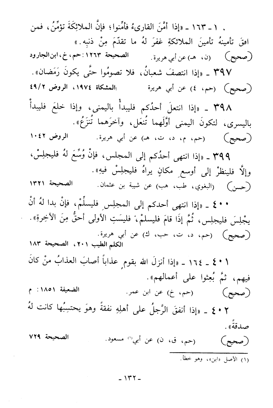 398 - «إذا انتعل أحدكم فليبدأ باليمنى وإذا خلع فليبدأ باليسرى لتكون اليمنى أولهما تنعل وآخرهما تنزع» .