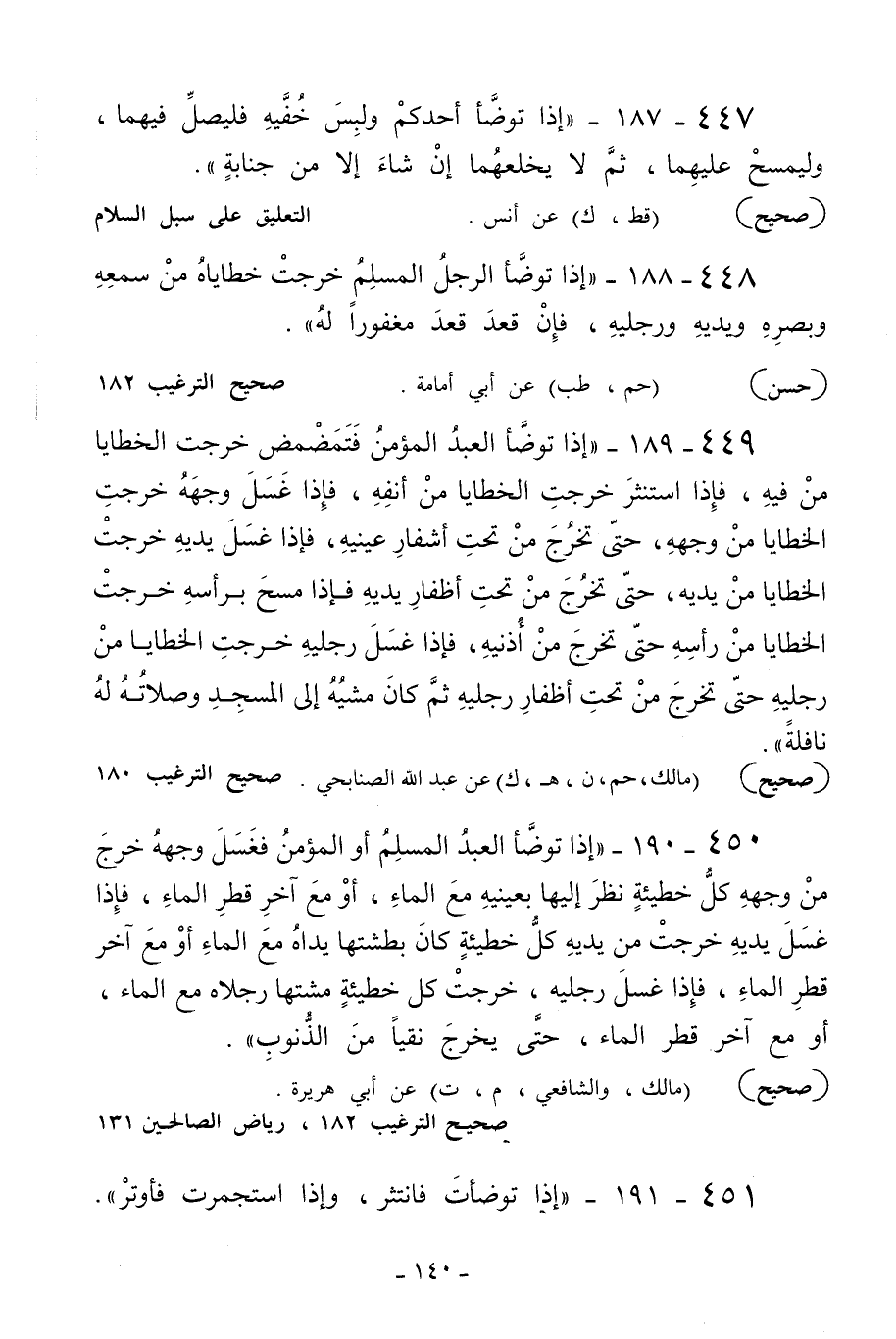 450 - 190 - «إذا توضأ العبد المسلم أو المؤمن فغسل وجهه خرج من وجهه كل خطيئة نظر إليها بعينيه مع الماء أو مع آخر قطر الماء فإذا غسل يديه خرجت من يديه كل خطيئة كان بطشتها يداه مع الماء أو مع آخر قطر الماء فإذا غسل رجليه خرجت كل خطيئة مشتها رجلاه مع الماء أو مع آخر قطر الماء حتى يخرج نقيا من الذنوب» .