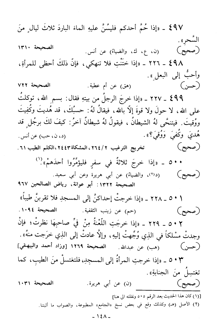 499 - 227 - «إذا خرج الرجل من بيته فقال: بسم الله توكلت على الله لا حول ولا قوة إلا بالله فيقال له: حسبك قد هديت وكفيت ووقيت فيتنحى له الشيطان فيقول له شيطان آخر: كيف لك برجل قد هدي وكفي ووقي؟» .