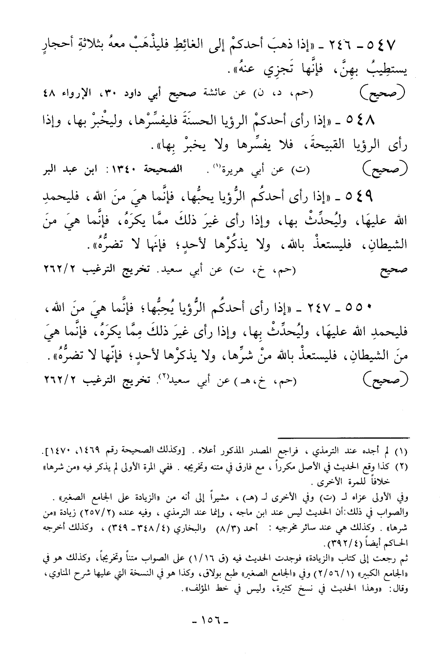 550 - 247 - «إذا رأى أحدكم الرؤيا يحبها فإنما هي من الله فليحمد الله عليها وليحدث بها، وإذا رأى غير ذلك مما يكره فإنما هي من الشيطان فليستعذ بالله من شرها ولا يذكرها لأحد فإنها لا تضره» .