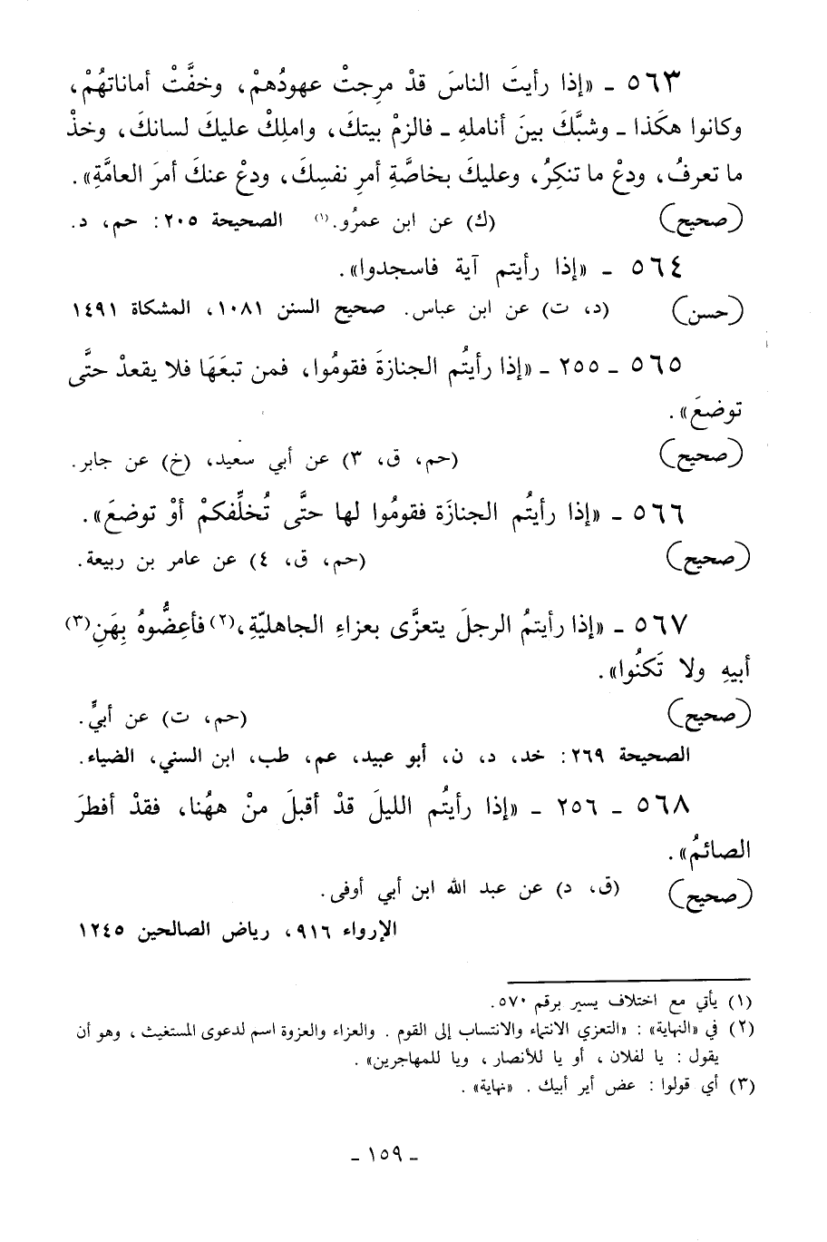 563 - «إذا رأيت الناس قد مرجت عهودهم وخفت أماناتهم وكانوا هكذا - وشبك بين أنامله - فالزم بيتك واملك عليك لسانك وخذ ما تعرف ودع ما تنكر، وعليك بخاصة أمر نفسك ودع عنك أمر العامة» .