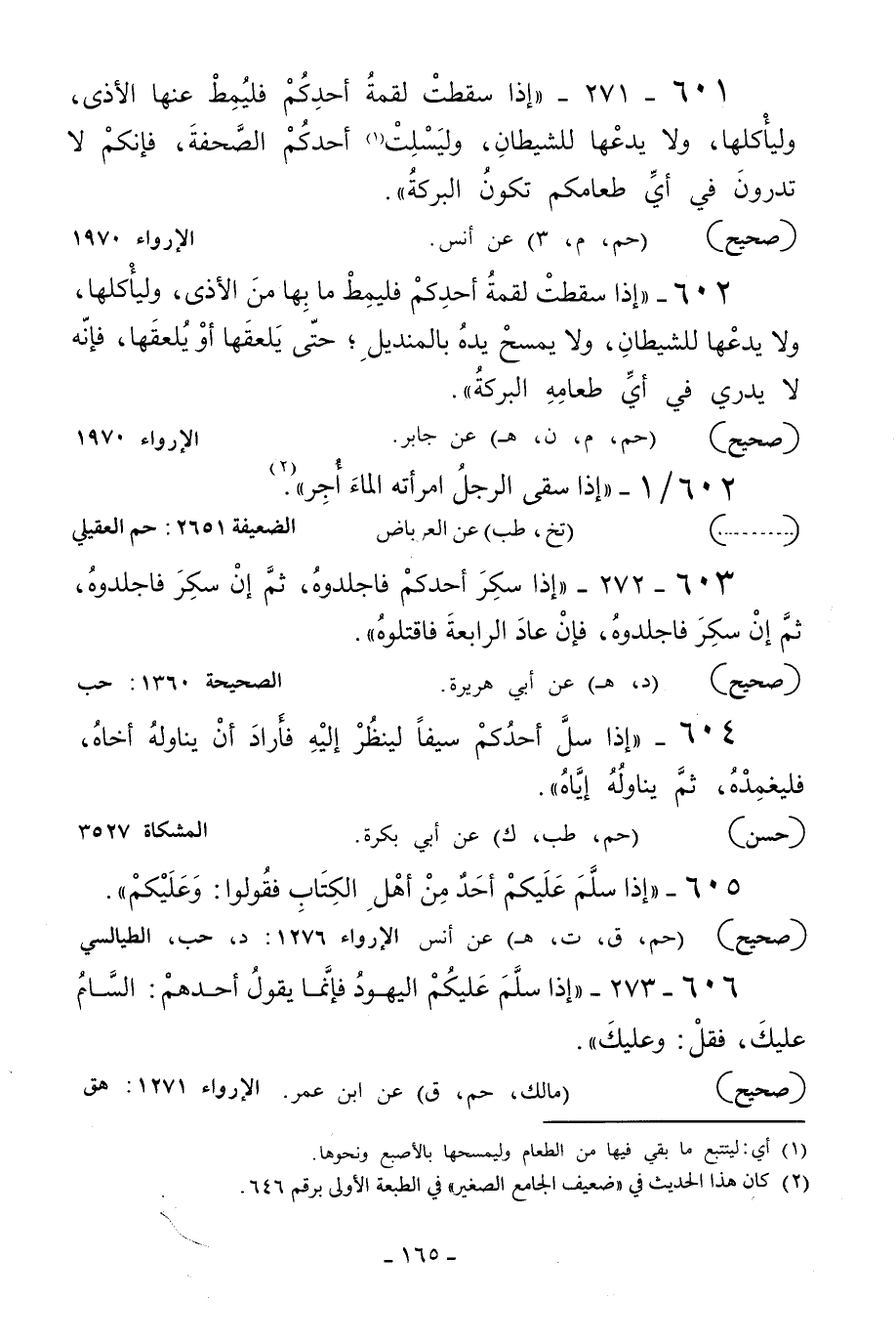 601 - «إذا سقطت لقمة أحدكم فليمط عنها الأذى وليأكلها ولا يدعها للشيطان وليسلت1 أحدكم الصحفة فإنكم لا تدرون في أي طعامكم تكون البركة» .