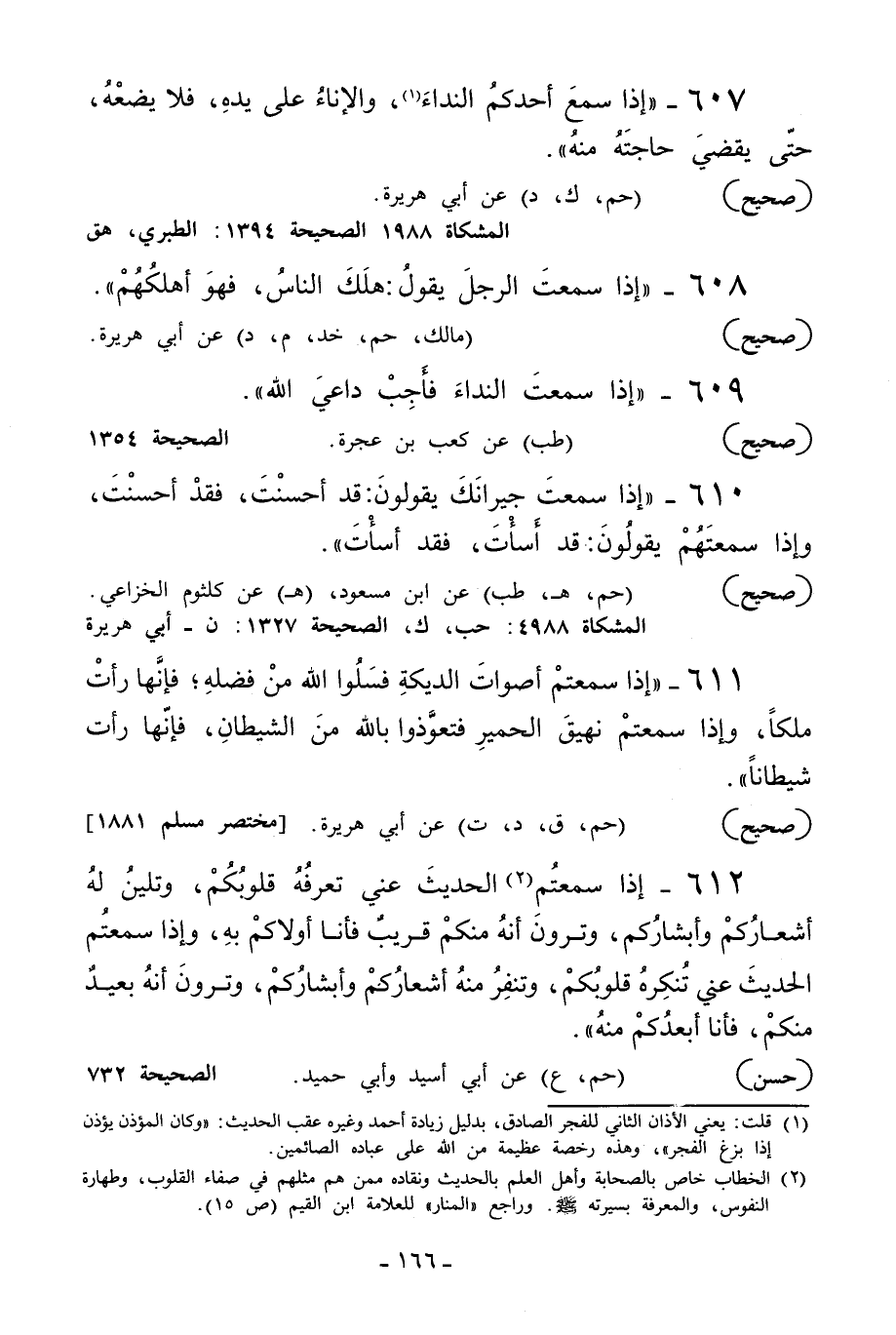 611 - «إذا سمعتم أصوات الديكة فسلوا الله من فضله فإنها رأت ملكا وإذا سمعتم نهيق الحمير فتعوذوا بالله من الشيطان فإنها رأت شيطانا» .