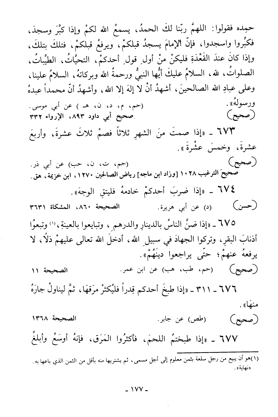 675 - «إذا ضن الناس بالدينار والدرهم وتبايعوا بالعينة1 وتبعوا أذناب البقر وتركوا الجهاد في سبيل الله أدخل الله تعالى عليهم ذلا لا يرفعه عنهم حتى يراجعوا دينهم» .