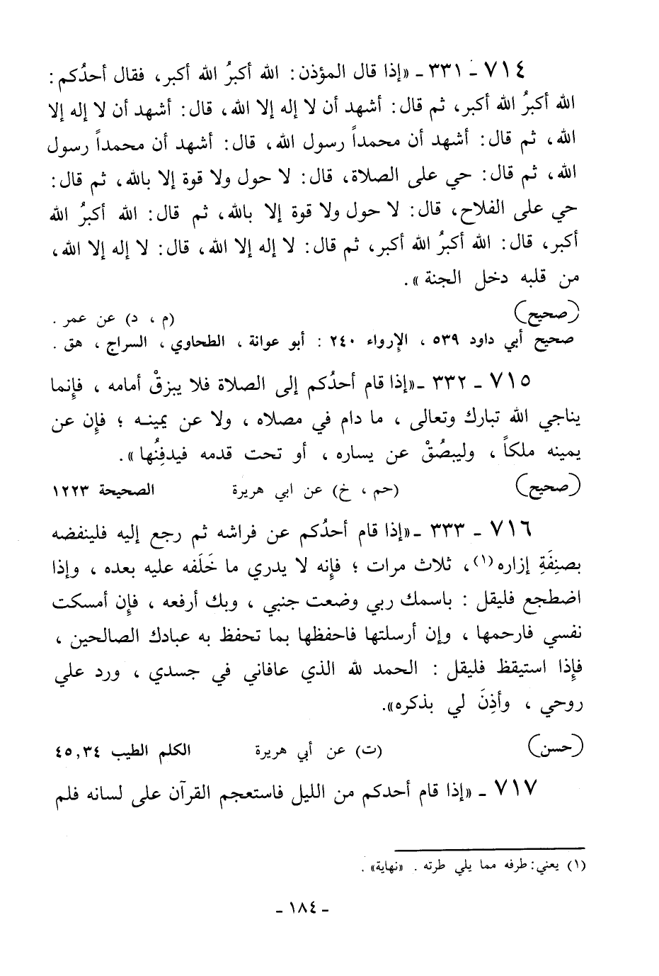 716 - 333 - «إذا قام أحدكم عن فراشه ثم رجع إليه فلينفضه بصنفة إزاره1 ثلاث مرات فإنه لا يدري ما خلفه عليه بعده، وإذا اضطجع فليقل: باسمك ربي وضعت جنبي وبك أرفعه فإن أمسكت نفسي فارحمها وإن أرسلتها فاحفظها بما تحفظ به عبادك الصالحين، فإذا استيقظ فليقل: الحمد لله الذي عافاني في جسدي ورد على روحي وأذن لي بذكره» .