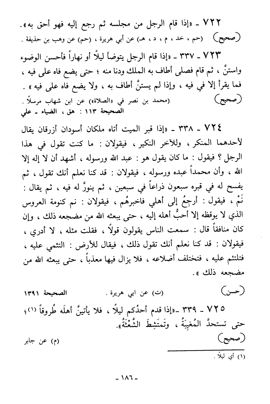 725 - 339 - «إذا قدم أحدكم ليلا فلا يأتين أهله طروقا1؛ حتى تستحد المغيبة وتمتشط الشعثة» .