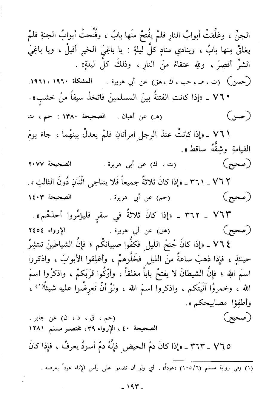 764 - «إذا كان جنح الليل فكفوا صبيانكم فإن الشياطين تنتشر حينئذ فإذا ذهب ساعة من الليل فخلوهم وأغلقوا الأبواب واذكروا اسم الله فإن الشيطان لا يفتح بابا مغلقا، وأوكئوا قربكم واذكروا اسم الله وخمروا آنيتكم واذكروا اسم الله ولو أن تعرضوا عليه شيئا1 وأطفئوا مصابيحكم» .