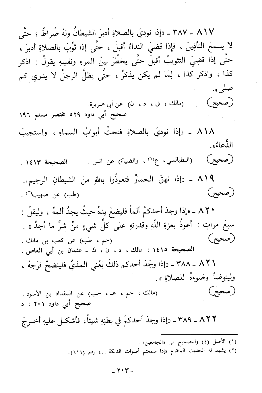 817 - 387 - «إذا نودي بالصلاة أدبر الشيطان وله ضراط، حتى لا يسمع التأذين فإذا قضي النداء أقبل حتى إذا ثوب بالصلاة أدبر حتى إذا قضي التثويب أقبل حتى يخطر بين المرء ونفسه يقول: اذكر كذا واذكر كذا لما لم يكن يذكر حتى يظل الرجل لا يدري كم صلى» .