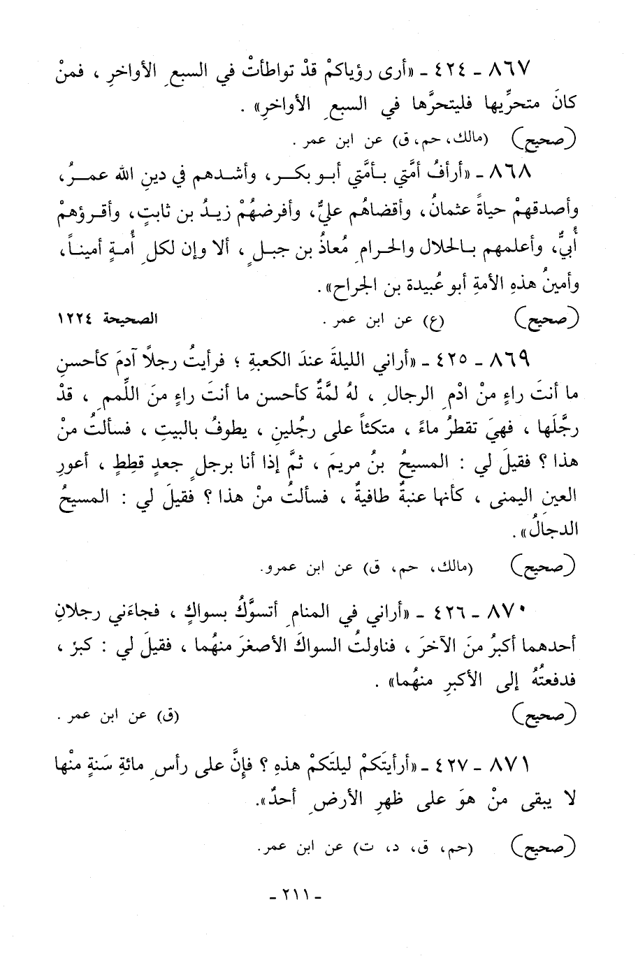 867 - 424 - «أرى رؤياكم قد تواطأت في السبع الأواخر فمن كان متحريها فليتحرها في السبع الأواخر» .