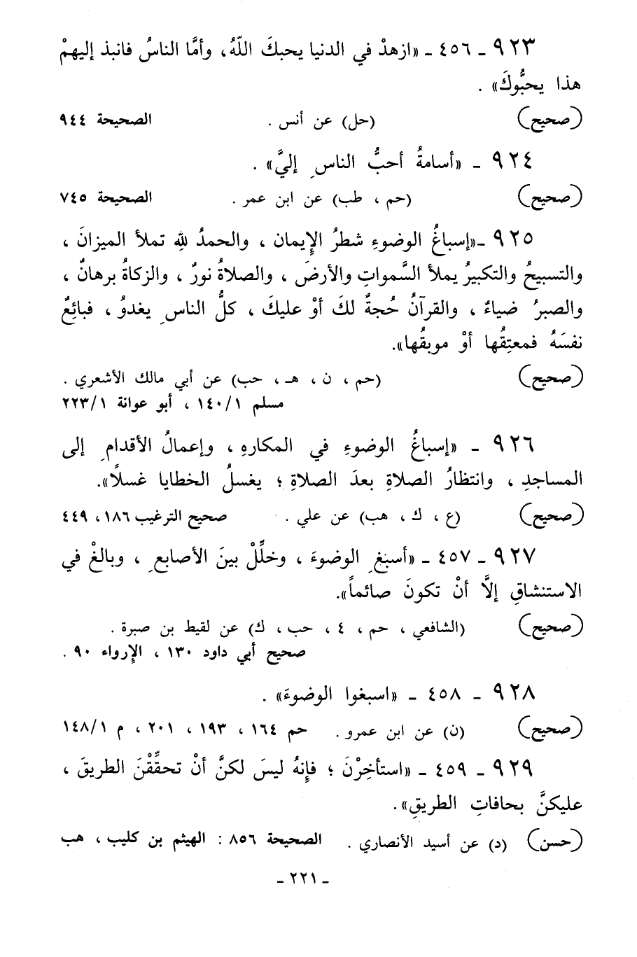 925 - «إسباغ الوضوء شطر الإيمان والحمد لله تملأ الميزان والتسبيح والتكبير يملأ السموات والأرض والصلاة نور والزكاة برهان والصبر ضياء والقرآن حجة لك أو عليك كل الناس يغدو فبائع نفسه فمعتقها أو موبقها» .
