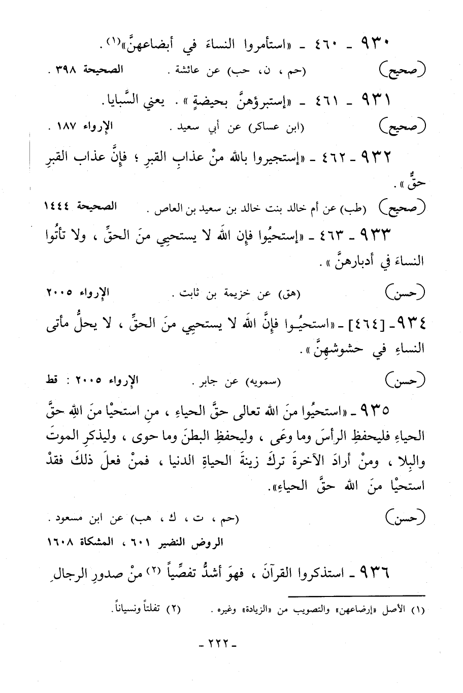 933 - 463 - «استحيوا فإن الله لا يستحيي من الحق لا تأتوا النساء في أدبارهن» .