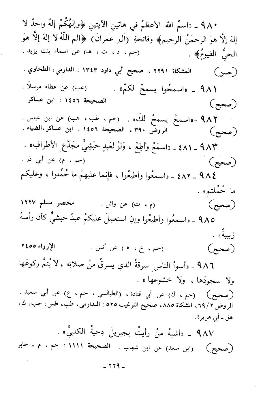 986 - «أسوأ الناس سرقة الذي يسرق من صلاته لا يتم ركوعها ولا سجودها ولا خشوعها» .