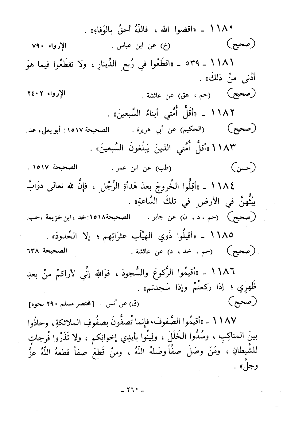 1187 - «أقيموا الصفوف فإنما تصفون بصفوف الملائكة وحاذوا بين المناكب وسدوا الخلل ولينوا بأيدي إخوانكم ولا تذروا فرجات للشيطان ومن وصل صفا وصله الله ومن قطع صفا قطعه الله عز وجل» .