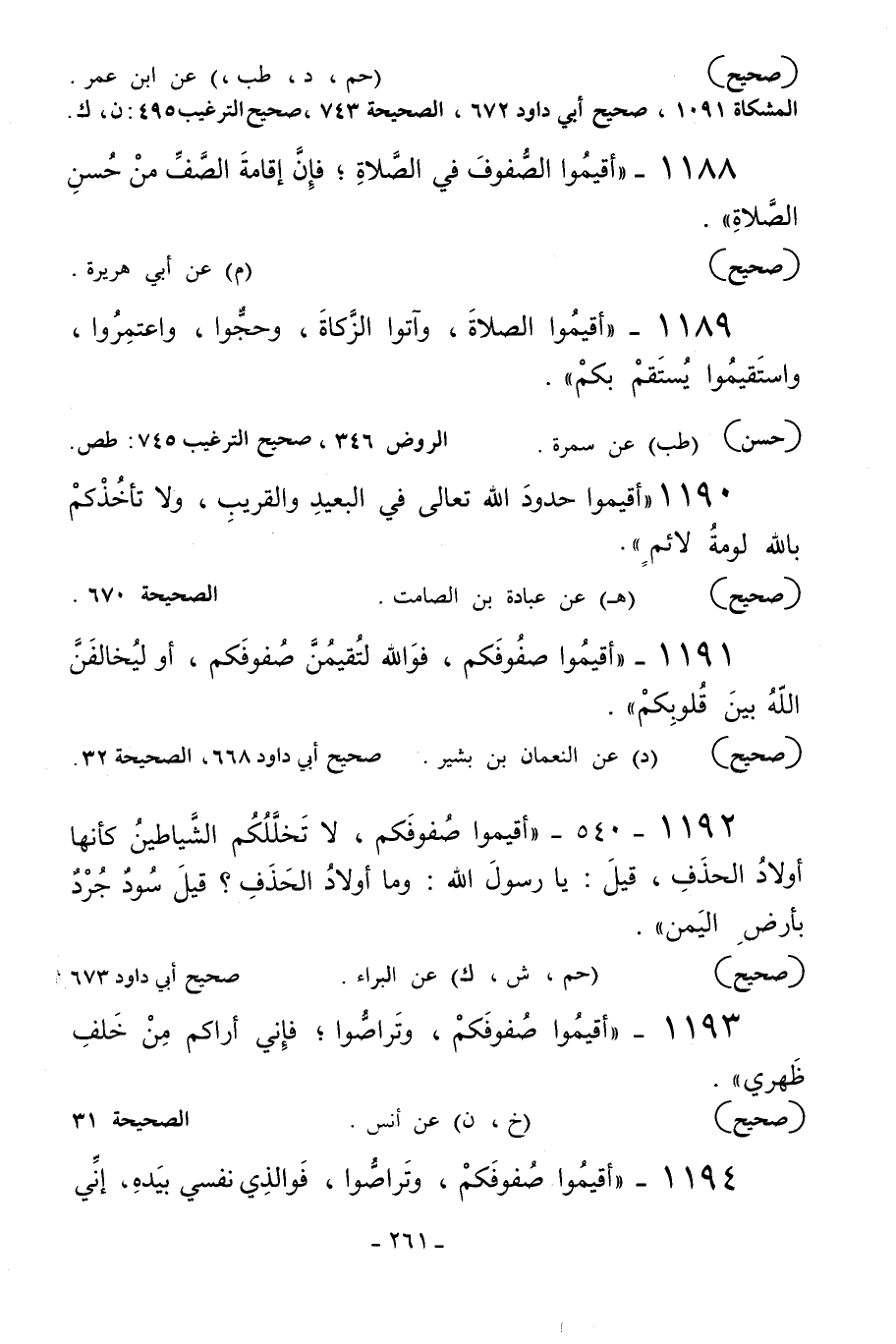 1191 - «أقيموا صفوفكم فوالله لتقيمن صفوفكم أو ليخالفن الله بين قلوبكم» .
