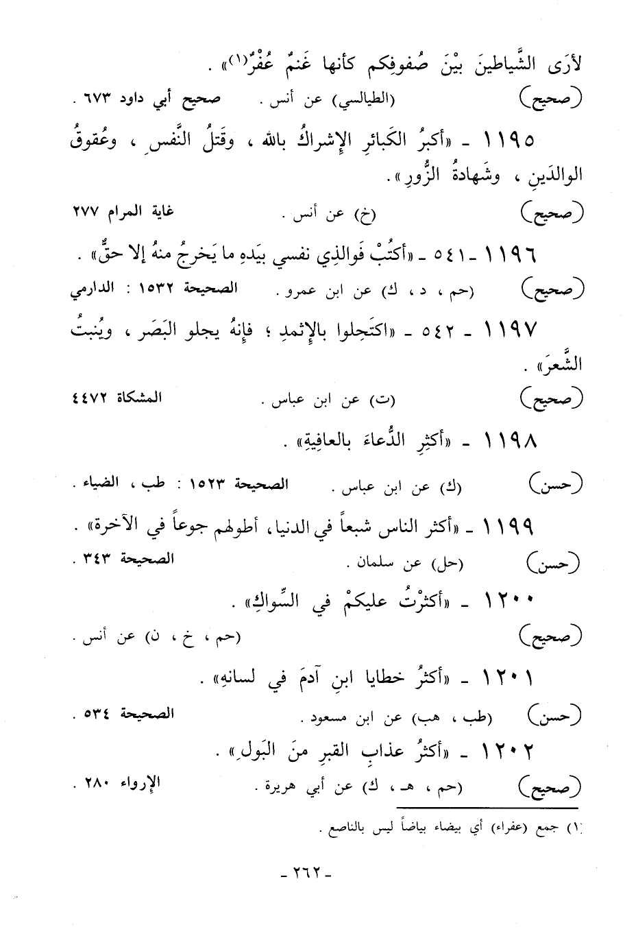 1195 - «أكبر الكبائر الإشراك بالله وقتل النفس وعقوق الوالدين وشهادة الزور» .
