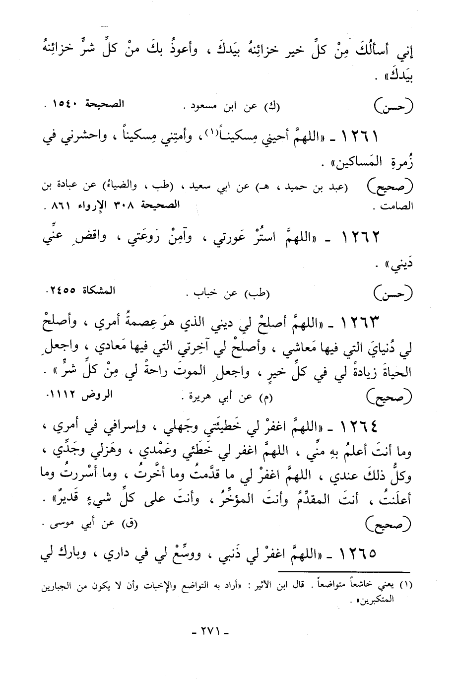 1261 - «اللهم أحيني مسكينا1 وأمتني مسكينا واحشرني في زمرة المساكين» .