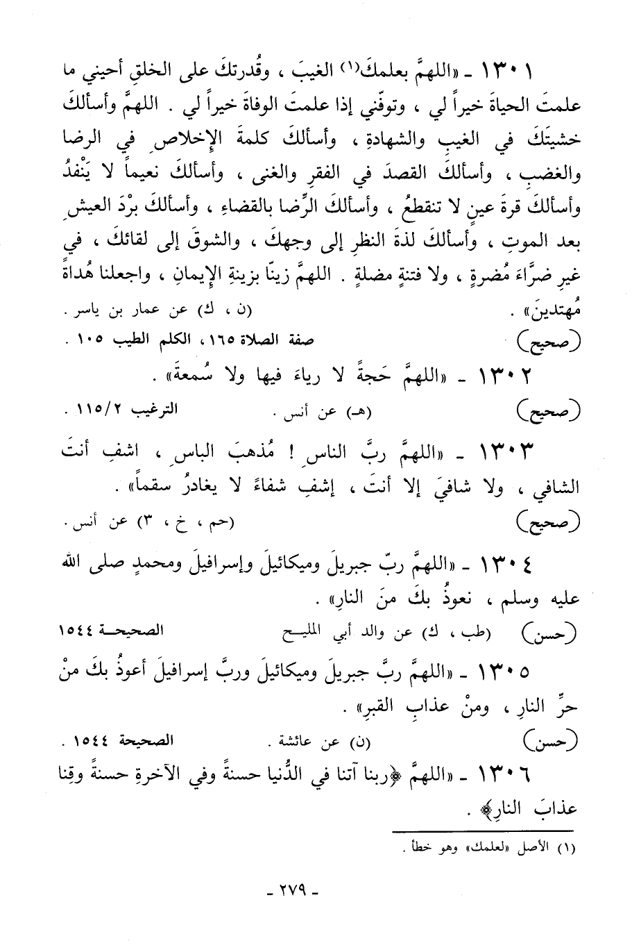 1301 - «اللهم بعلمك1 الغيب وقدرتك على الخلق أحيني ما علمت الحياة خيرا لي وتوفني إذا علمت الوفاة خيرا لي اللهم وأسألك خشيتك في الغيب والشهادة وأسألك كلمة الإخلاص في الرضا والغضب وأسألك القصد في الفقر والغنى وأسألك نعيما لا ينفد وأسألك قرة عين لا تنقطع وأسألك الرضا بالقضاء وأسألك برد العيش بعد الموت وأسألك لذة النظر إلى وجهك والشوق إلى لقائك في غير ضراء مضرة ولا فتنة مضلة اللهم زينا بزينة الإيمان واجعلنا هداة مهتدين» .