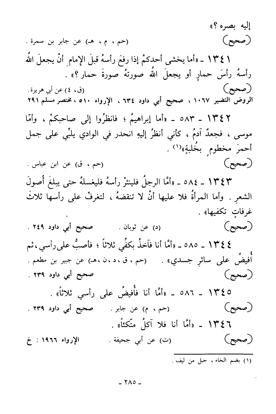 1342 - 583 - «أما إبراهيم فانظروا إلى صاحبكم وأما موسى فجعد آدم كأني أنظر إليه انحدر في الوادي يلبي على جمل أحمر مخطوم بخلبة» 1.