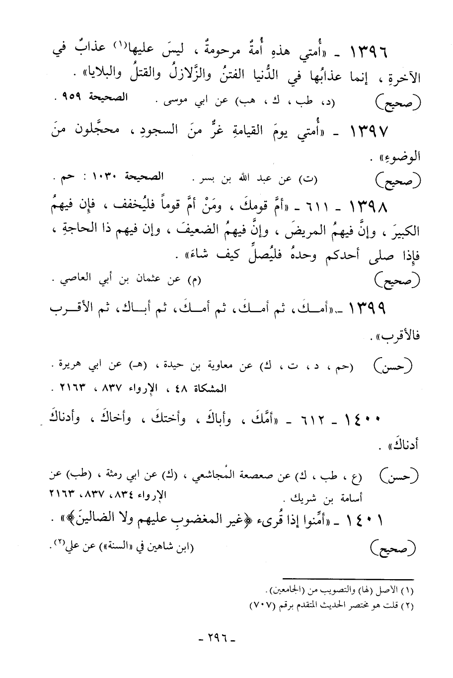 1396 - «أمتي هذه أمة مرحومة ليس عليها1 عذاب في الآخرة إنما عذابها في الدنيا الفتن والزلازل والقتل والبلايا» .