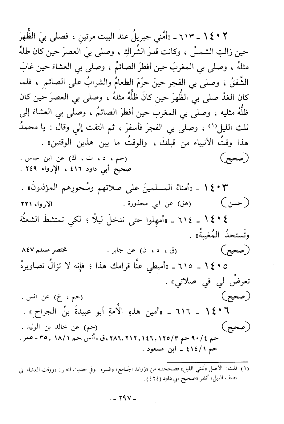 1402 - 613 - «أمني جبريل عند البيت مرتين فصلى بي الظهر حين زالت الشمس وكانت قدر الشراك وصلى بي العصر حين كان ظله مثله وصلى بي المغرب حين أفطر الصائم وصلى بي العشاء حين غاب الشفق وصلى بي الفجر حين حرم الطعام والشراب على الصائم فلما كان الغد صلى بي الظهر حين كان ظله مثله وصلى بي العصر حين كان ظله مثليه وصلى بي المغرب حين أفطر الصائم وصلى بي العشاء إلى ثلث الليل1 وصلى بي الفجر فأسفر ثم التفت إلي وقال: يا محمد هذا وقت الأنبياء من قبلك والوقت ما بين هذين الوقتين» .