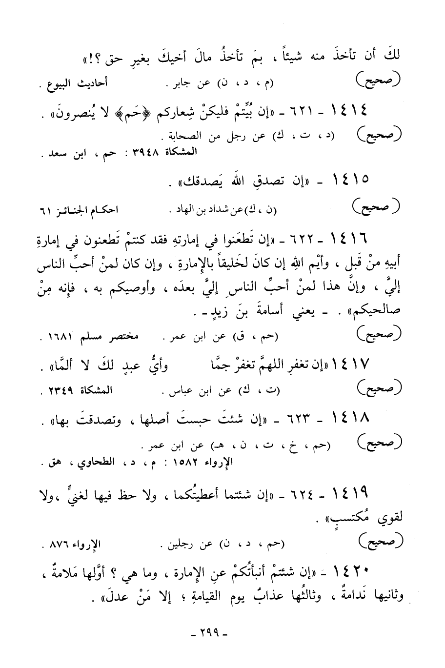 1420 - «إن شئتم أنبأتكم عن الإمارة وما هي؟ أولها ملامة وثانيها ندامة وثالثها عذاب يوم القيامة إلا من عدل» .