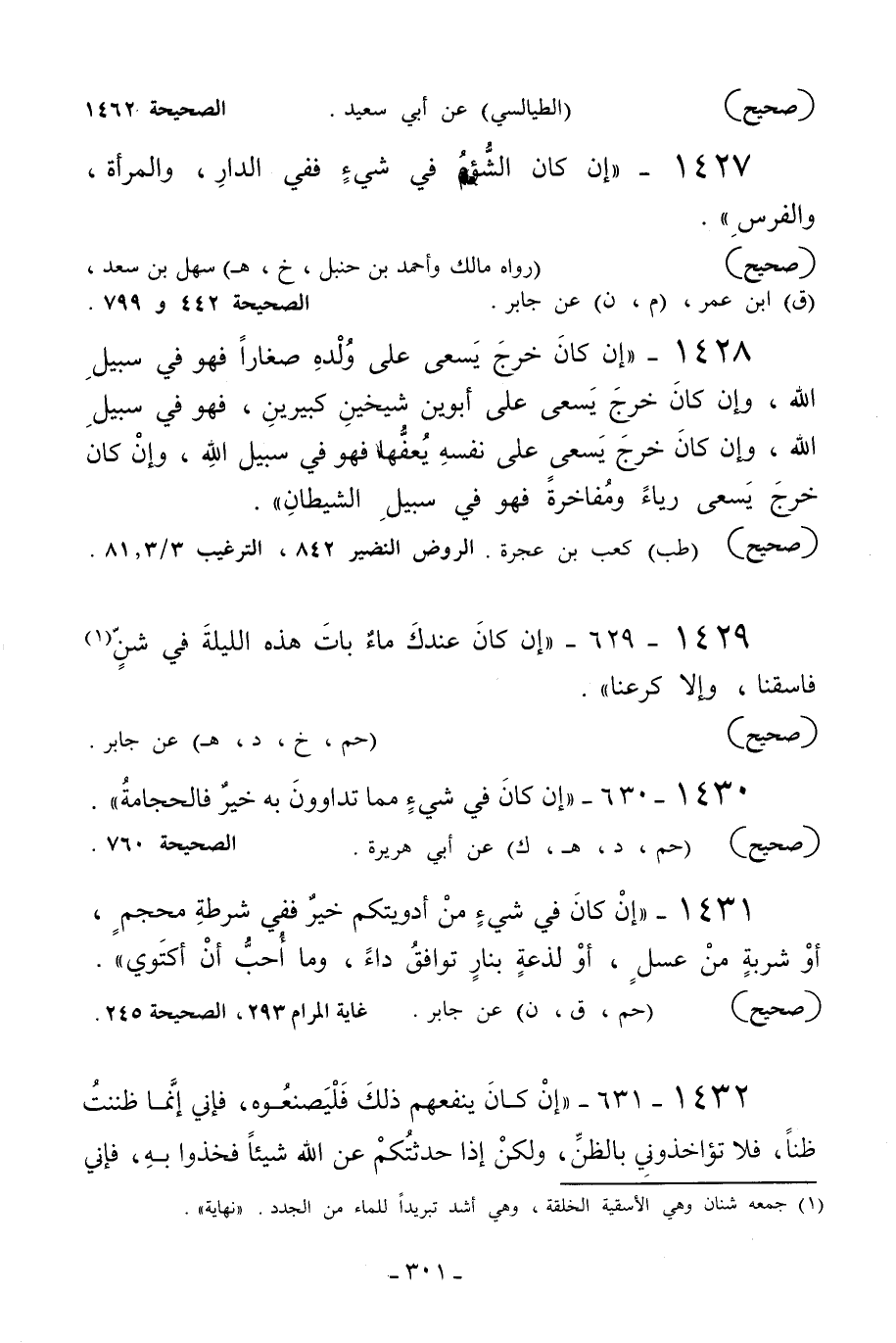 1428 - «إن كان خرج يسعى على ولده صغارا فهو في سبيل الله وإن كان خرج يسعى على أبوين شيخين كبيرين فهو في سبيل الله وإن كان خرج يسعى على نفسه يعفها فهو في سبيل الله وإن كان خرج يسعى رياء ومفاخرة فهو في سبيل الشيطان» .
