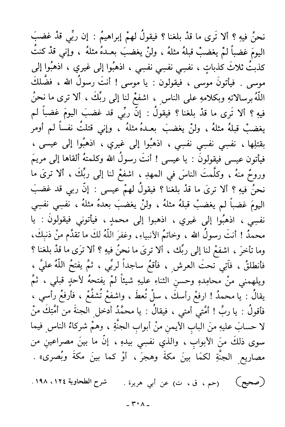 نحن فيه؟ ألا ترى ما قد بلغنا؟ فيقول لهم إبراهيم: إن ربي قد غضب اليوم غضبا لم يغضب قبله مثله ولن يغضب بعده مثله وإني قد كنت كذبت ثلاث كذبات نفسي نفسي نفسي اذهبوا إلى غيري اذهبوا إلى موسى; فيأتون موسى فيقولون: يا موسى! أنت رسول الله فضلك الله برسالاته وبكلامه على الناس اشفع لنا إلى ربك ألا ترى ما نحن فيه؟ ألا ترى ما قد بلغنا؟ فيقول: إن ربي قد غضب اليوم غضبا لم يغضب قبله مثله ولن يغضب بعده مثله وإني قتلت نفسا لم أومر بقتلها نفسي نفسي نفسي اذهبوا إلى غيري اذهبوا إلى عيسى; فيأتون عيسى! فيقولون: يا عيسى أنت رسول الله وكلمته ألقاها إلى مريم وروح منه وكلمت الناس في المهد اشفع لنا إلى ربك ألا ترى ما نحن فيه؟ ألا ترى ما قد بلغنا؟ فيقول لهم عيسى: إن ربي قد غضب اليوم غضبا لم يغضب قبله مثله ولن يغضب بعده مثله نفسي نفسي نفسي اذهبوا إلى غيري اذهبوا إلى محمد; فيأتوني فيقولون: يا محمد! أنت رسول الله وخاتم الأنبياء وغفر الله لك ما تقدم من ذنبك وما تأخر اشفع لنا إلى ربك ألا ترى ما نحن فيه؟ ألا ترى ما قد بلغنا؟ فأنطلق فآتي تحت العرش فأقع ساجدا لربي ثم يفتح الله علي ويلهمني من محامده وحسن الثناء عليه شيئا لم يفتحه لأحد قبلي ثم يقال: يا محمد! ارفع رأسك سل تعط واشفع تشفع فأرفع رأسي فأقول: يا رب! أمتي أمتي فيقال: يا محمد أدخل الجنة من أمتك من لا حساب عليه من الباب الأيمن من أبواب الجنة وهم شركاء الناس فيما سوى ذلك من الأبواب والذي نفسي بيده إن ما بين مصراعين من مصاريع الجنة لكما بين مكة وهجر أوكما بين مكة وبصرى".