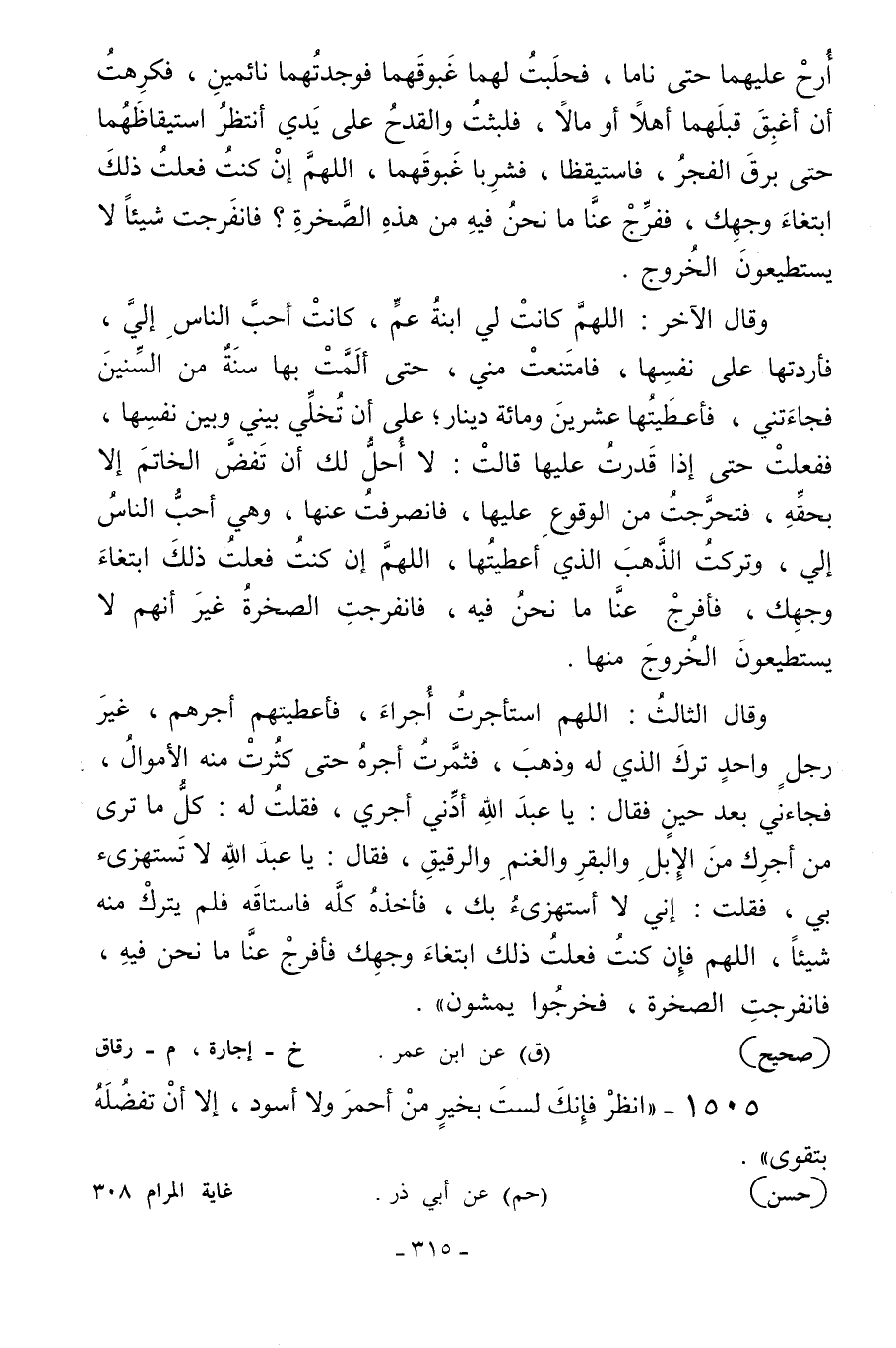 أرح عليهما حتى ناما فحلبت لهما غبوقهما فوجدتهما نائمين فكرهت أن أغبق قبلهما أهلا أو مالا فلبثت والقدح على يدي أنتظر استيقاظهما حتى برق الفجر فاستيقظا فشربا غبوقهما اللهم إن كنت فعلت ذلك ابتغاء وجهك ففرج عنا ما نحن فيه من هذه الصخرة؟ فانفرجت شيئا لا يستطيعون الخروج; وقال الآخر: اللهم كانت لي ابنة عم كانت أحب الناس إلى فأردتها على نفسها فامتنعت مني حتى ألمت بها سنة من السنين فجاءتني فأعطيتها عشرين ومائة دينار على أن تخلي بيني وبين نفسها ففعلت حتى إذا قدرت عليها قالت: لا أحل لك أن تفض الخاتم إلا بحقه فتحرجت من الوقوع عليها فانصرفت عنها وهي أحب الناس إلي وتركت الذهب الذي أعطيتها اللهم إن كنت فعلت ذلك ابتغاء وجهك فافرج عنا ما نحن فيه فانفرجت الصخرة غير أنهم لا يستطيعون الخروج منها; وقال الثالث: اللهم استأجرت أجراء فأعطيتهم أجرهم غير رجل واحد ترك الذي له وذهب فثمرت أجره حتى كثرت منه الأموال فجاءني بعد حين فقال: يا عبد الله أدني أجري فقلت له: كل ما ترى من أجرك من الإبل والبقر والغنم والرقيق فقال: يا عبد الله لا تستهزئ بي فقلت: إني لا أستهزئ بك فأخذه كله فاستاقه فلم يترك منه شيئا اللهم فإن كنت فعلت ذلك ابتغاء وجهك فافرج عنا ما نحن فيه فانفرجت الصخرة فخرجوا يمشون".